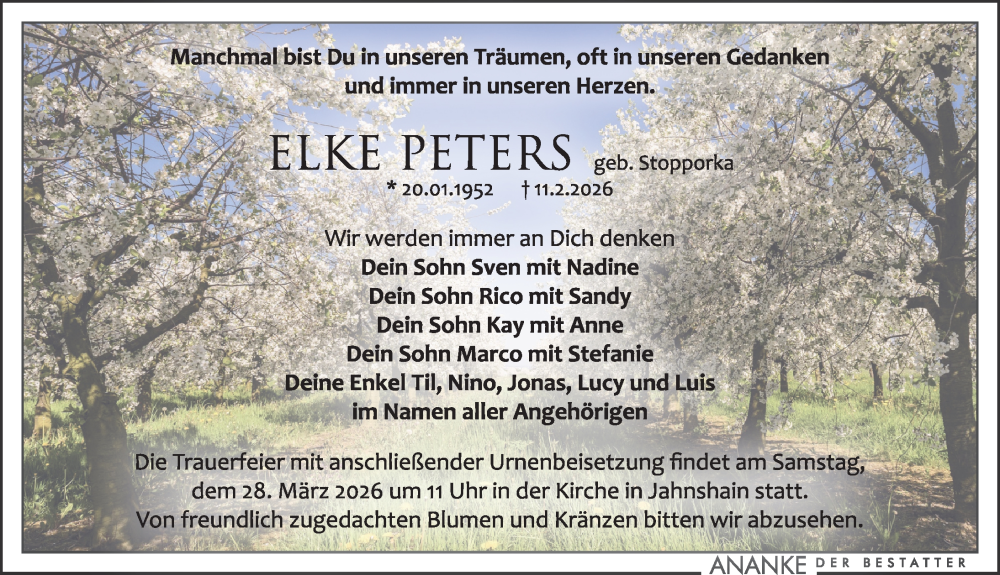 Hier finden Sie alle Traueranzeigen aus der Zeitung, die bisher für Elke Peters erschienen sind. Weitere Traueranzeigen, die in der Zeitung erscheinen, werden hier ebenfalls aufgelistet