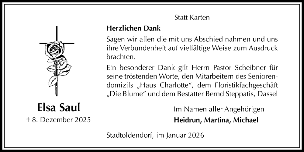 Hier finden Sie alle Traueranzeigen aus der Zeitung, die bisher für Elsa Saul erschienen sind. Weitere Traueranzeigen, die in der Zeitung erscheinen, werden hier ebenfalls aufgelistet