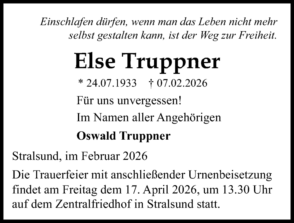 Hier finden Sie alle Traueranzeigen aus der Zeitung, die bisher für Else Truppner erschienen sind. Weitere Traueranzeigen, die in der Zeitung erscheinen, werden hier ebenfalls aufgelistet