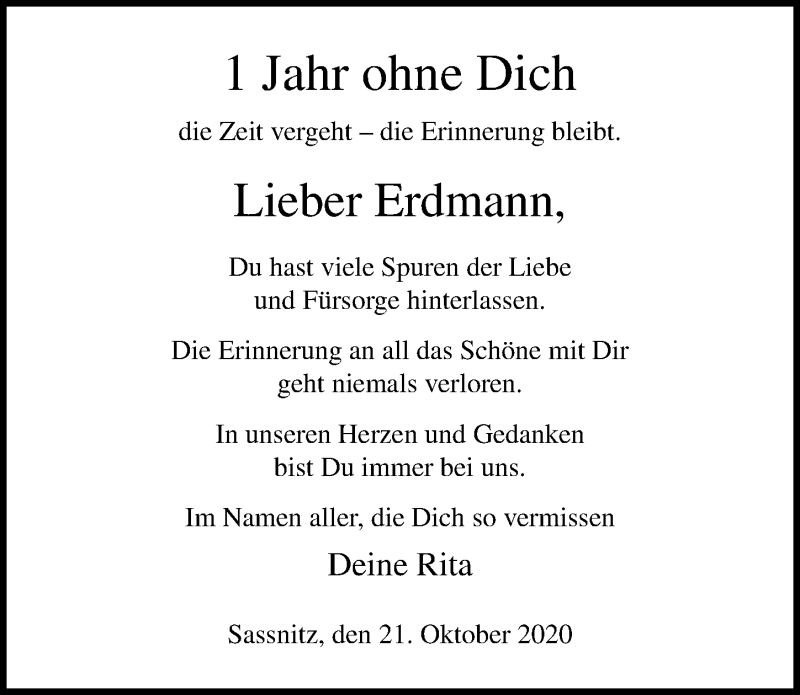 Hier finden Sie alle Traueranzeigen aus der Zeitung, die bisher für Erdmann erschienen sind. Weitere Traueranzeigen, die in der Zeitung erscheinen, werden hier ebenfalls aufgelistet
