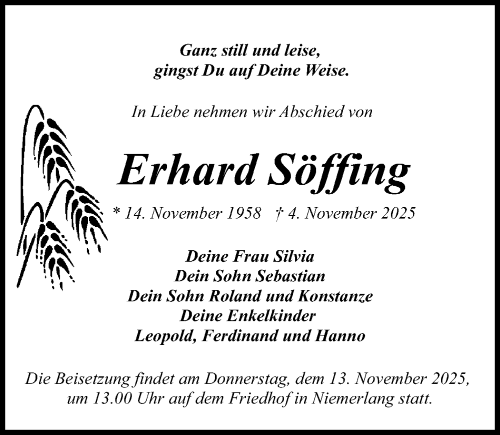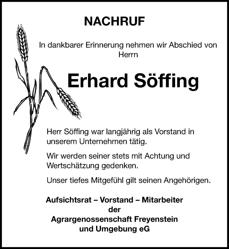Hier finden Sie alle Traueranzeigen aus der Zeitung, die bisher für Erhard Söffing erschienen sind. Weitere Traueranzeigen, die in der Zeitung erscheinen, werden hier ebenfalls aufgelistet