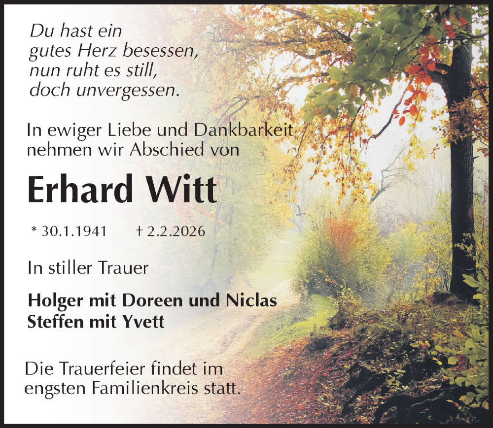 Hier finden Sie alle Traueranzeigen aus der Zeitung, die bisher für Erhard Witt erschienen sind. Weitere Traueranzeigen, die in der Zeitung erscheinen, werden hier ebenfalls aufgelistet