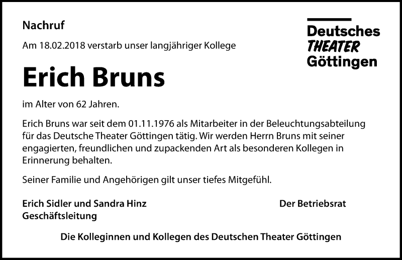 Hier finden Sie alle Traueranzeigen aus der Zeitung, die bisher für Erich Bruns erschienen sind. Weitere Traueranzeigen, die in der Zeitung erscheinen, werden hier ebenfalls aufgelistet