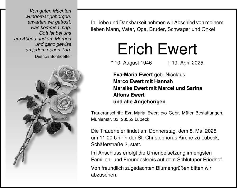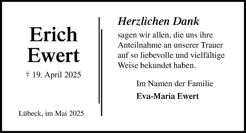 Hier finden Sie alle Traueranzeigen aus der Zeitung, die bisher für Erich Ewert erschienen sind. Weitere Traueranzeigen, die in der Zeitung erscheinen, werden hier ebenfalls aufgelistet