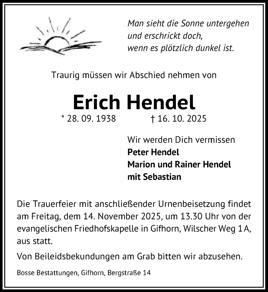 Hier finden Sie alle Traueranzeigen aus der Zeitung, die bisher für Erich Hendel erschienen sind. Weitere Traueranzeigen, die in der Zeitung erscheinen, werden hier ebenfalls aufgelistet