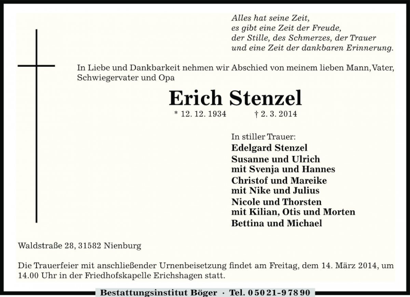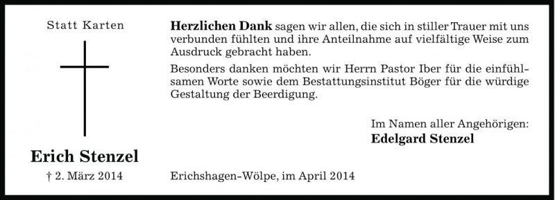 Hier finden Sie alle Traueranzeigen aus der Zeitung, die bisher für Erich Stenzel erschienen sind. Weitere Traueranzeigen, die in der Zeitung erscheinen, werden hier ebenfalls aufgelistet