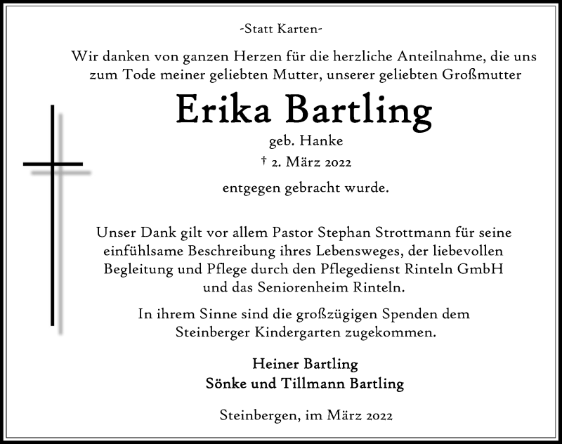 Hier finden Sie alle Traueranzeigen aus der Zeitung, die bisher für Erika Bartling erschienen sind. Weitere Traueranzeigen, die in der Zeitung erscheinen, werden hier ebenfalls aufgelistet