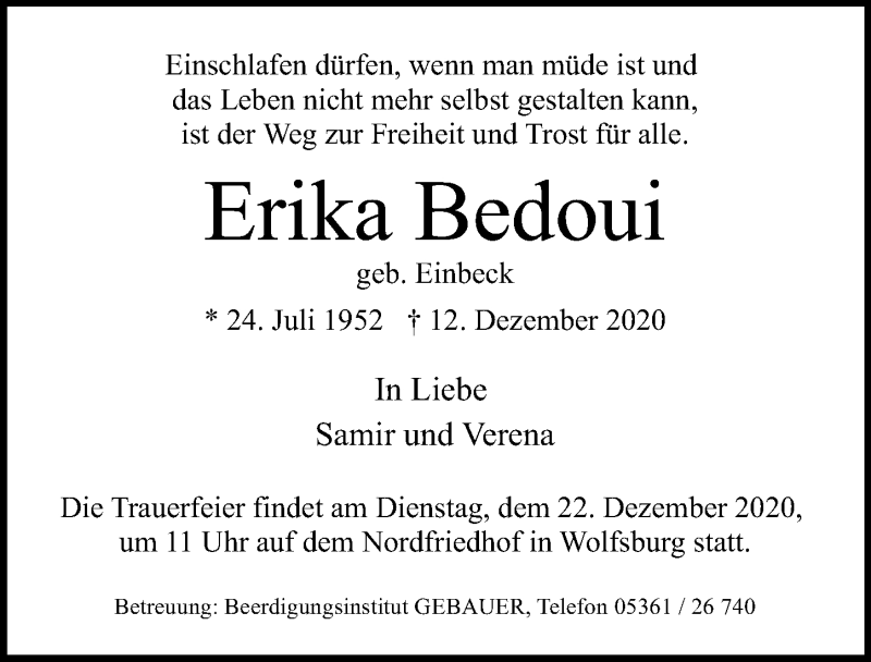 Hier finden Sie alle Traueranzeigen aus der Zeitung, die bisher für Erika Bedoui erschienen sind. Weitere Traueranzeigen, die in der Zeitung erscheinen, werden hier ebenfalls aufgelistet