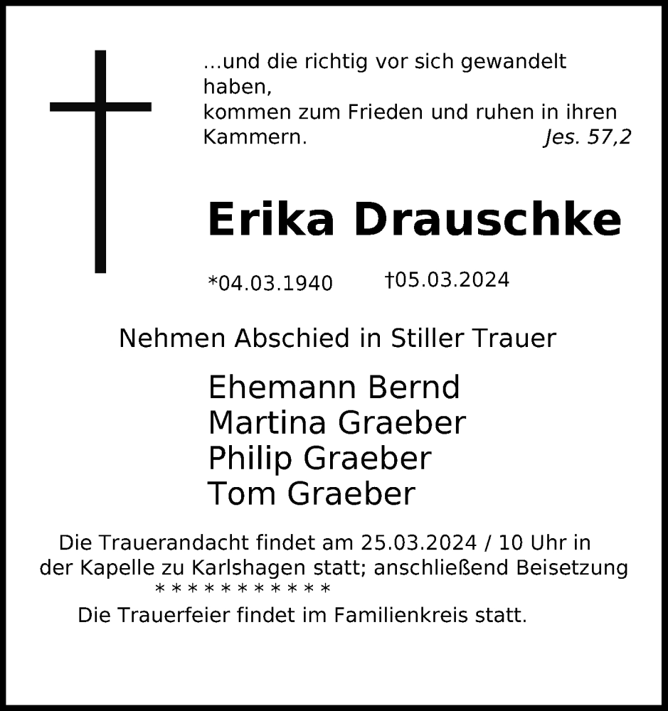 Hier finden Sie alle Traueranzeigen aus der Zeitung, die bisher für Erika Drauschke erschienen sind. Weitere Traueranzeigen, die in der Zeitung erscheinen, werden hier ebenfalls aufgelistet