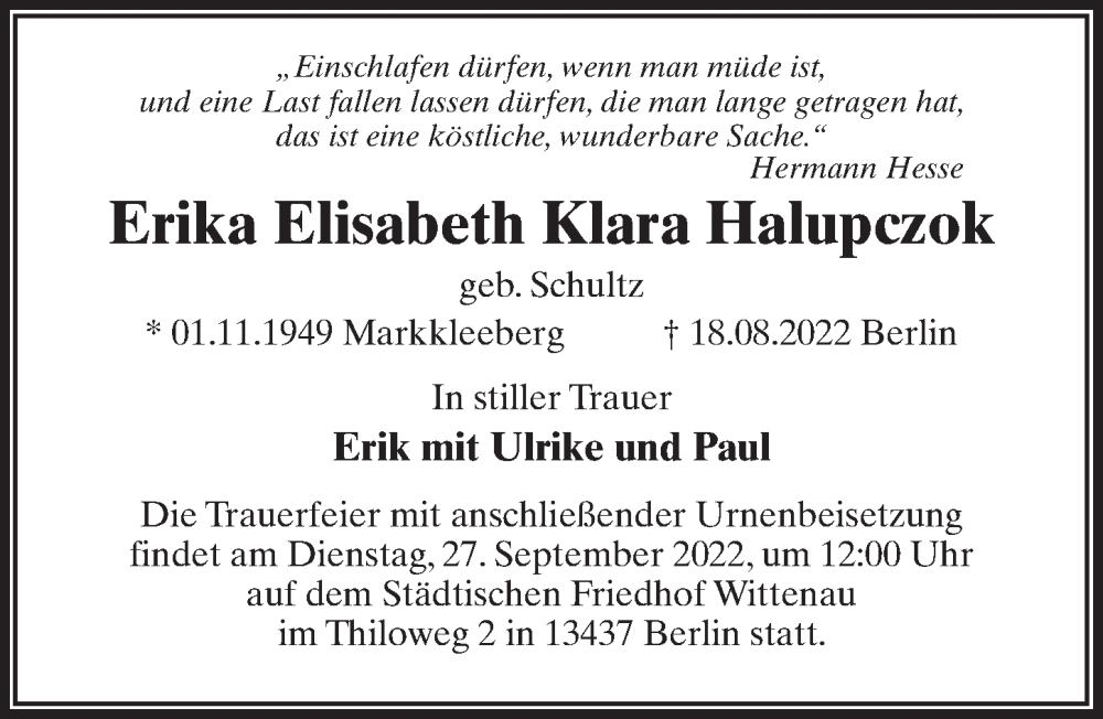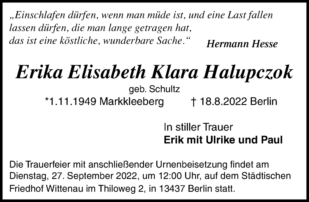 Hier finden Sie alle Traueranzeigen aus der Zeitung, die bisher für Erika Elisabeth Klara Halupczok erschienen sind. Weitere Traueranzeigen, die in der Zeitung erscheinen, werden hier ebenfalls aufgelistet