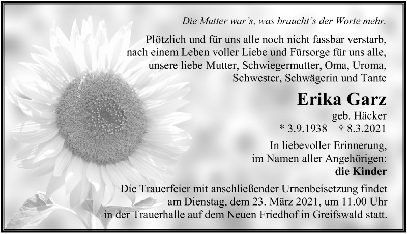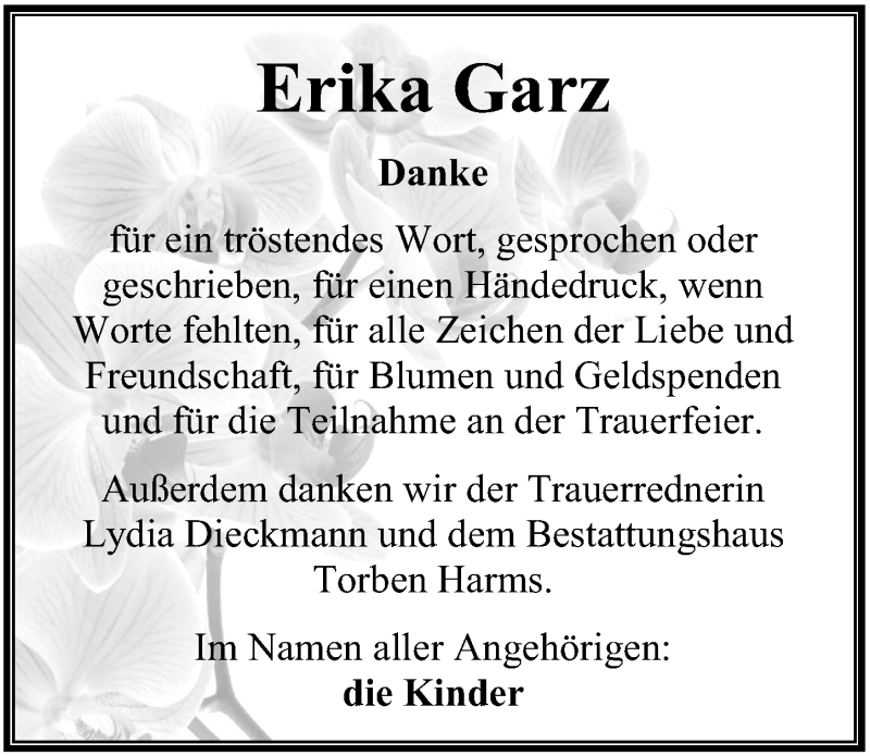 Hier finden Sie alle Traueranzeigen aus der Zeitung, die bisher für Erika Garz erschienen sind. Weitere Traueranzeigen, die in der Zeitung erscheinen, werden hier ebenfalls aufgelistet
