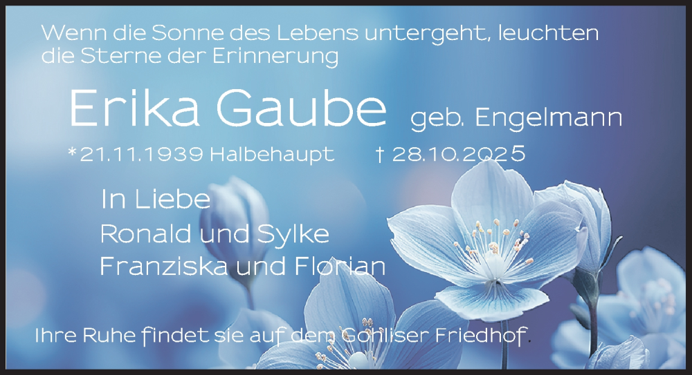 Hier finden Sie alle Traueranzeigen aus der Zeitung, die bisher für Erika Gaube erschienen sind. Weitere Traueranzeigen, die in der Zeitung erscheinen, werden hier ebenfalls aufgelistet