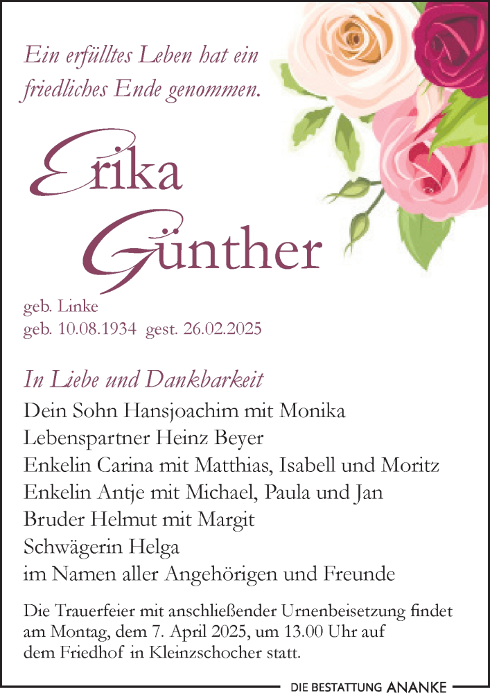 Hier finden Sie alle Traueranzeigen aus der Zeitung, die bisher für Erika Günther erschienen sind. Weitere Traueranzeigen, die in der Zeitung erscheinen, werden hier ebenfalls aufgelistet