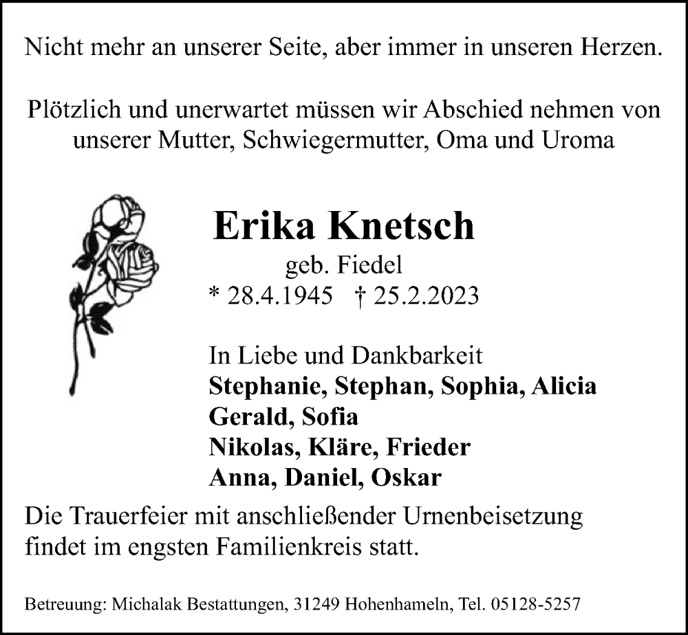 Hier finden Sie alle Traueranzeigen aus der Zeitung, die bisher für Erika Knetsch erschienen sind. Weitere Traueranzeigen, die in der Zeitung erscheinen, werden hier ebenfalls aufgelistet