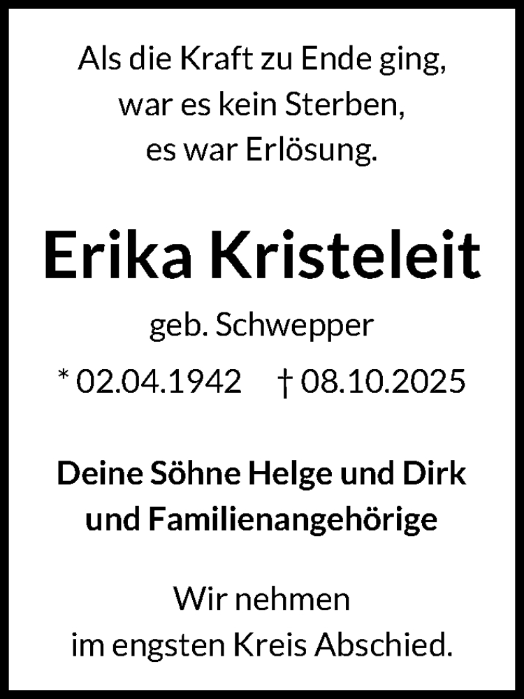 Hier finden Sie alle Traueranzeigen aus der Zeitung, die bisher für Erika Kristeleit erschienen sind. Weitere Traueranzeigen, die in der Zeitung erscheinen, werden hier ebenfalls aufgelistet