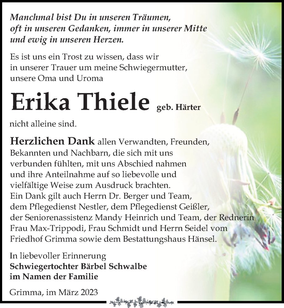 Hier finden Sie alle Traueranzeigen aus der Zeitung, die bisher für Erika Thiele erschienen sind. Weitere Traueranzeigen, die in der Zeitung erscheinen, werden hier ebenfalls aufgelistet