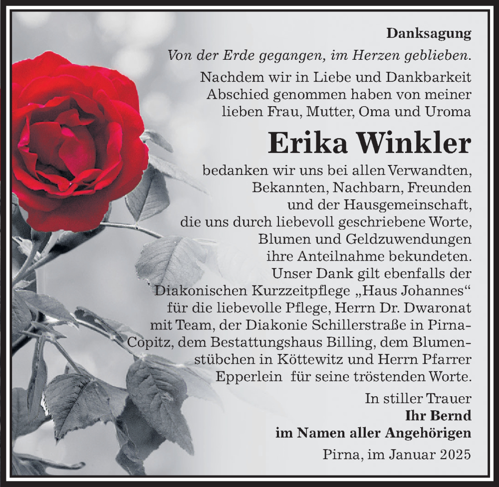 Hier finden Sie alle Traueranzeigen aus der Zeitung, die bisher für Erika Winkler erschienen sind. Weitere Traueranzeigen, die in der Zeitung erscheinen, werden hier ebenfalls aufgelistet
