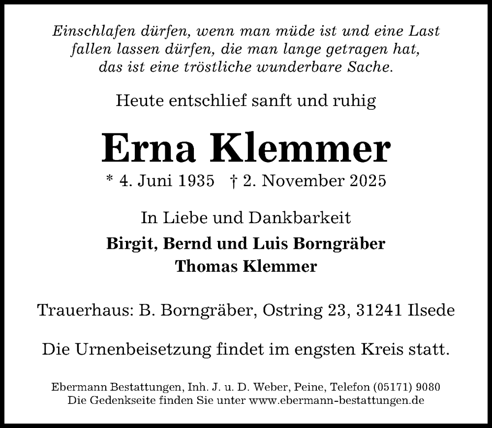 Hier finden Sie alle Traueranzeigen aus der Zeitung, die bisher für Erna Klemmer erschienen sind. Weitere Traueranzeigen, die in der Zeitung erscheinen, werden hier ebenfalls aufgelistet