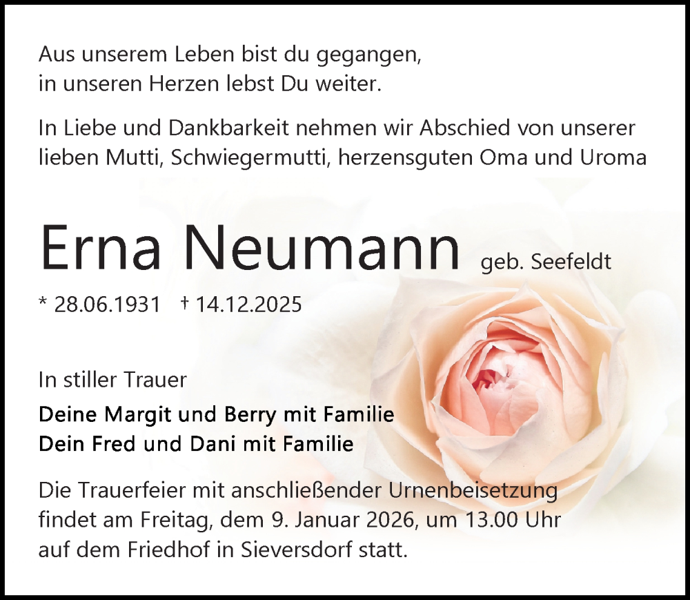 Hier finden Sie alle Traueranzeigen aus der Zeitung, die bisher für Erna Neumann erschienen sind. Weitere Traueranzeigen, die in der Zeitung erscheinen, werden hier ebenfalls aufgelistet