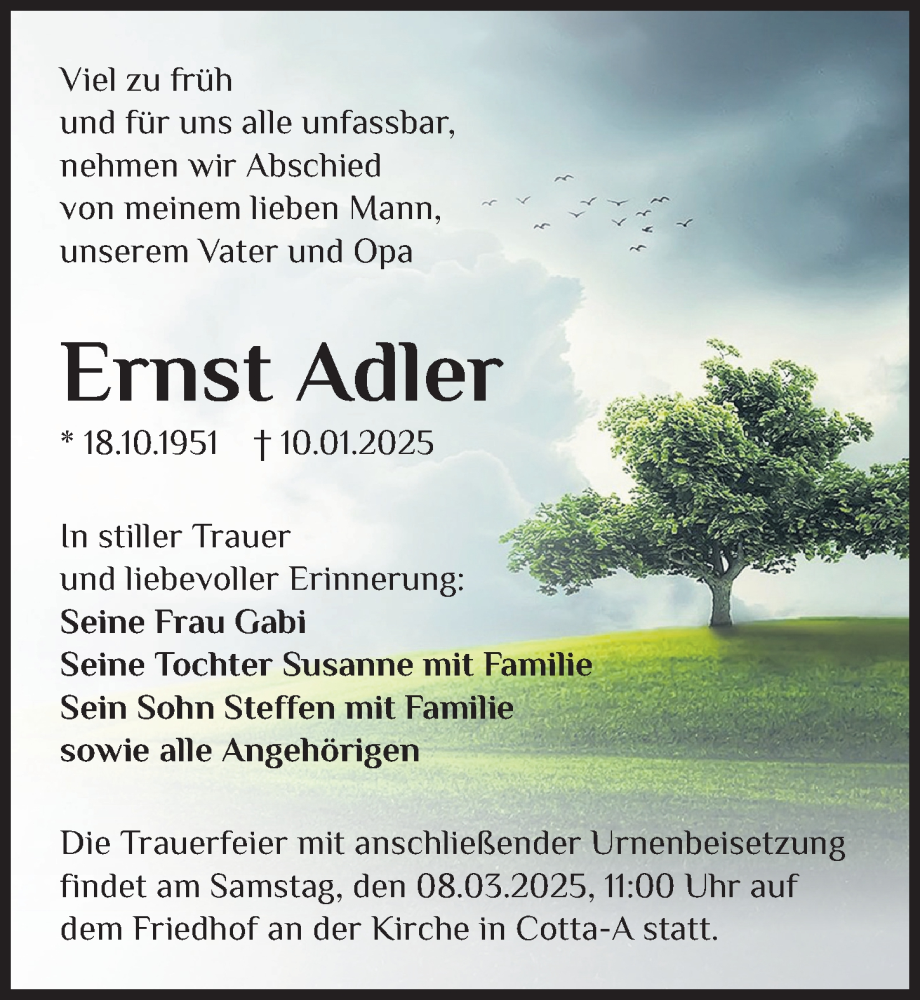 Hier finden Sie alle Traueranzeigen aus der Zeitung, die bisher für Ernst Adler erschienen sind. Weitere Traueranzeigen, die in der Zeitung erscheinen, werden hier ebenfalls aufgelistet