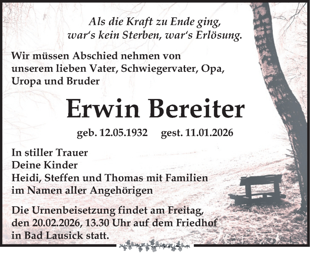 Hier finden Sie alle Traueranzeigen aus der Zeitung, die bisher für Erwin Bereiter erschienen sind. Weitere Traueranzeigen, die in der Zeitung erscheinen, werden hier ebenfalls aufgelistet
