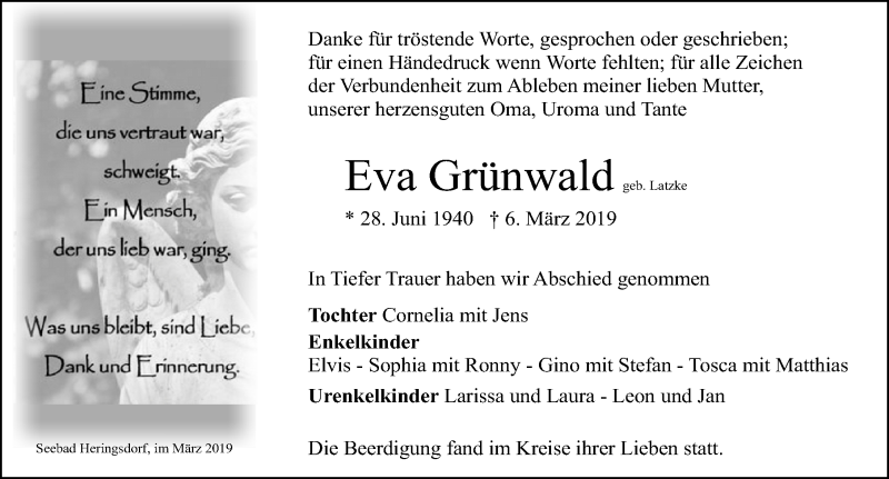 Hier finden Sie alle Traueranzeigen aus der Zeitung, die bisher für Eva Grünwald erschienen sind. Weitere Traueranzeigen, die in der Zeitung erscheinen, werden hier ebenfalls aufgelistet