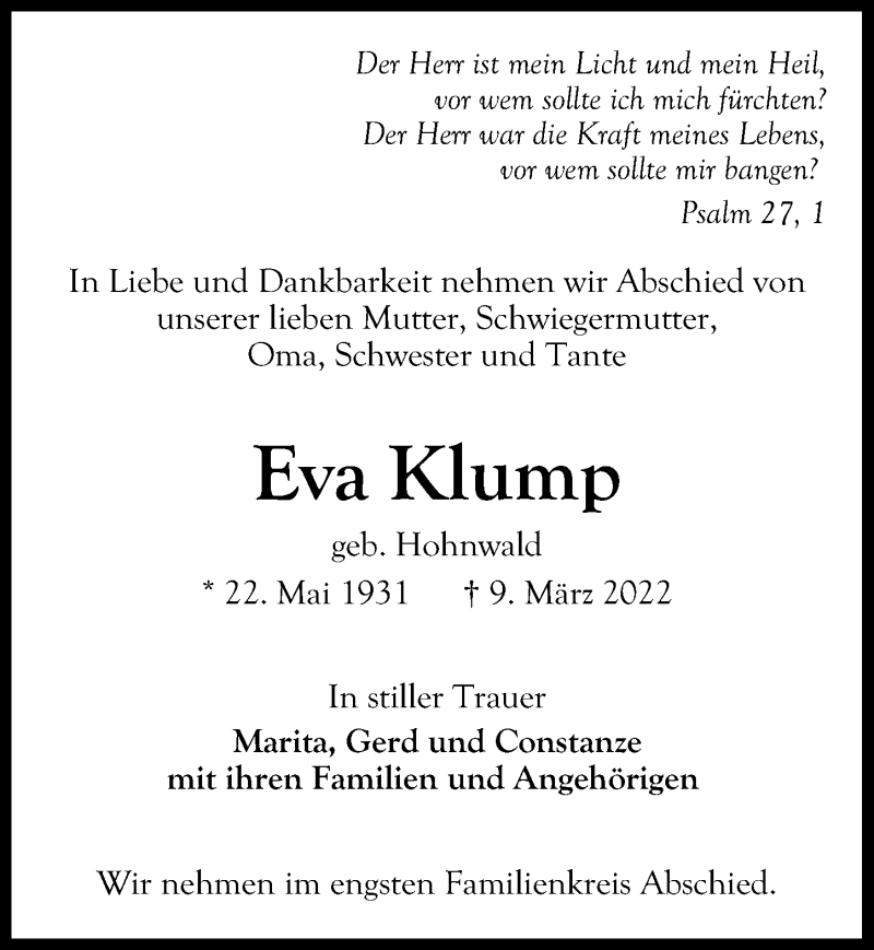 Hier finden Sie alle Traueranzeigen aus der Zeitung, die bisher für Eva Klump erschienen sind. Weitere Traueranzeigen, die in der Zeitung erscheinen, werden hier ebenfalls aufgelistet
