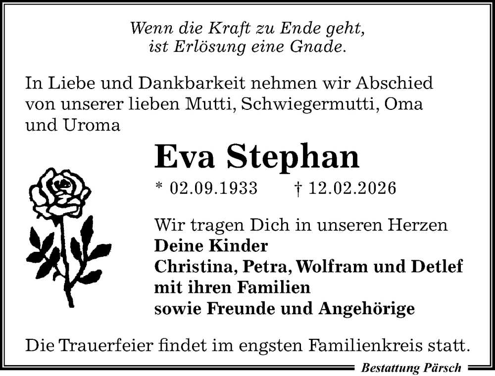 Hier finden Sie alle Traueranzeigen aus der Zeitung, die bisher für Eva Stephan erschienen sind. Weitere Traueranzeigen, die in der Zeitung erscheinen, werden hier ebenfalls aufgelistet