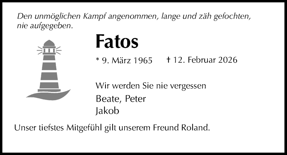 Hier finden Sie alle Traueranzeigen aus der Zeitung, die bisher für Fatos erschienen sind. Weitere Traueranzeigen, die in der Zeitung erscheinen, werden hier ebenfalls aufgelistet