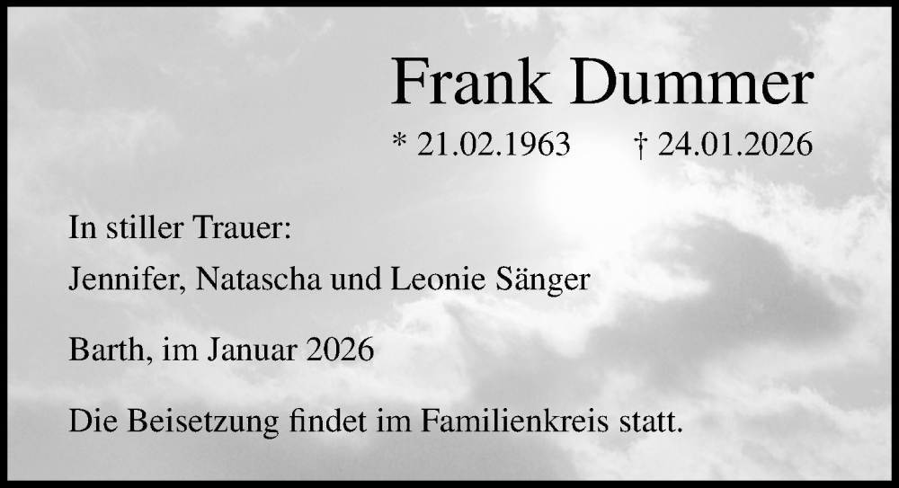 Hier finden Sie alle Traueranzeigen aus der Zeitung, die bisher für Frank Dummer erschienen sind. Weitere Traueranzeigen, die in der Zeitung erscheinen, werden hier ebenfalls aufgelistet