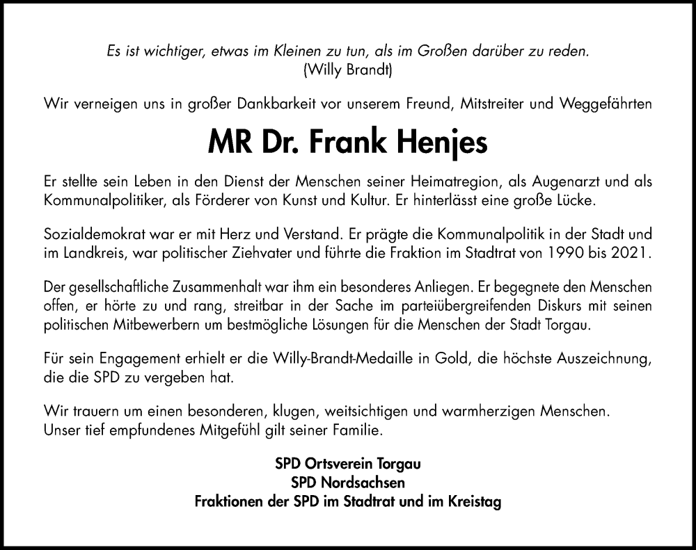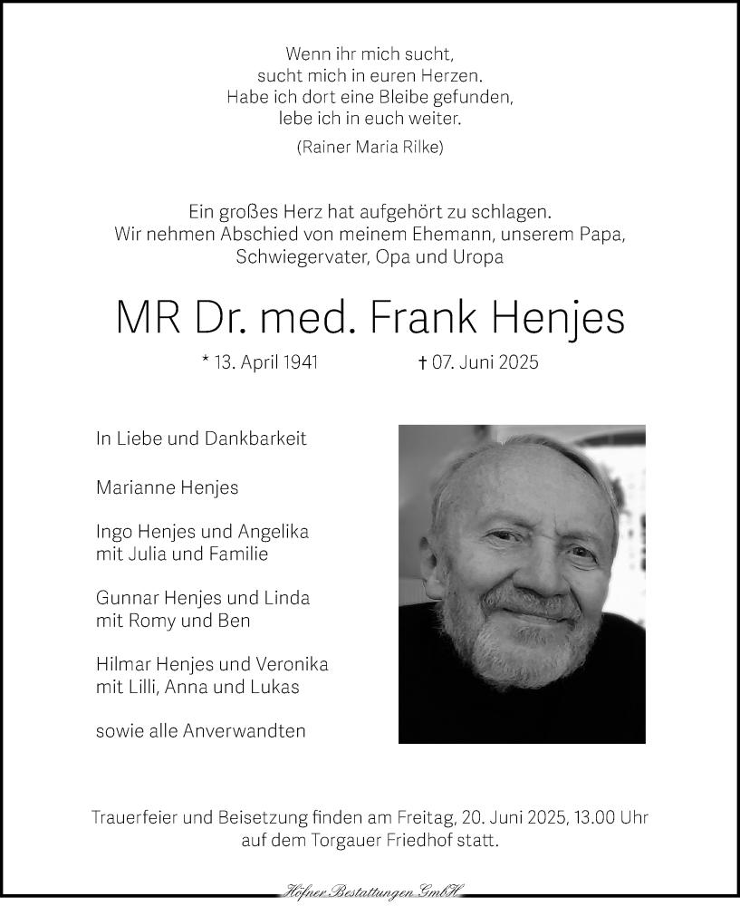 Hier finden Sie alle Traueranzeigen aus der Zeitung, die bisher für Frank Henjes erschienen sind. Weitere Traueranzeigen, die in der Zeitung erscheinen, werden hier ebenfalls aufgelistet