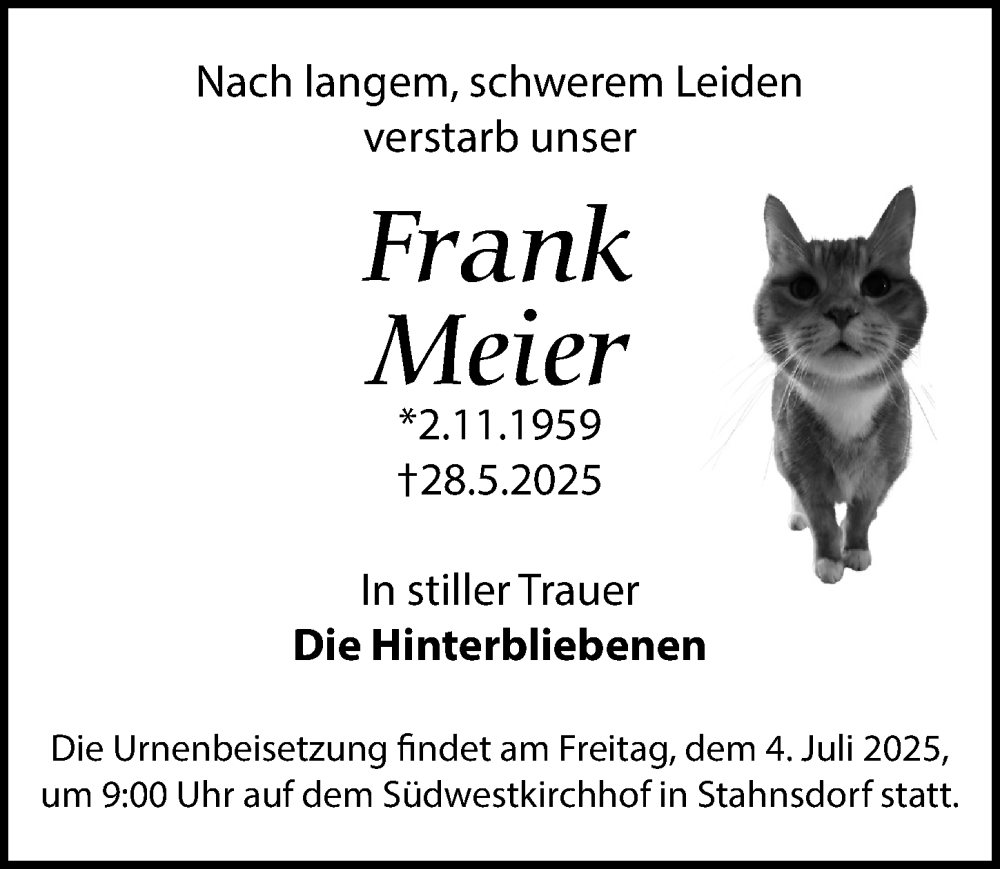 Hier finden Sie alle Traueranzeigen aus der Zeitung, die bisher für Frank Meier erschienen sind. Weitere Traueranzeigen, die in der Zeitung erscheinen, werden hier ebenfalls aufgelistet