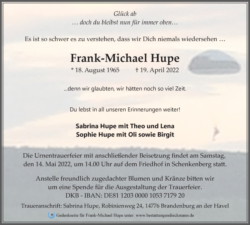 Hier finden Sie alle Traueranzeigen aus der Zeitung, die bisher für Frank-Michael Hupe erschienen sind. Weitere Traueranzeigen, die in der Zeitung erscheinen, werden hier ebenfalls aufgelistet