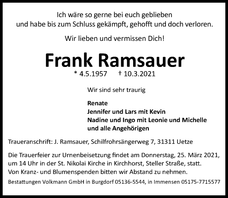 Hier finden Sie alle Traueranzeigen aus der Zeitung, die bisher für Frank Ramsauer erschienen sind. Weitere Traueranzeigen, die in der Zeitung erscheinen, werden hier ebenfalls aufgelistet