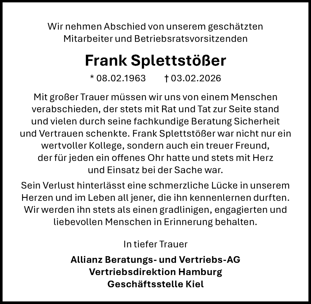 Hier finden Sie alle Traueranzeigen aus der Zeitung, die bisher für Frank Splettstößer erschienen sind. Weitere Traueranzeigen, die in der Zeitung erscheinen, werden hier ebenfalls aufgelistet