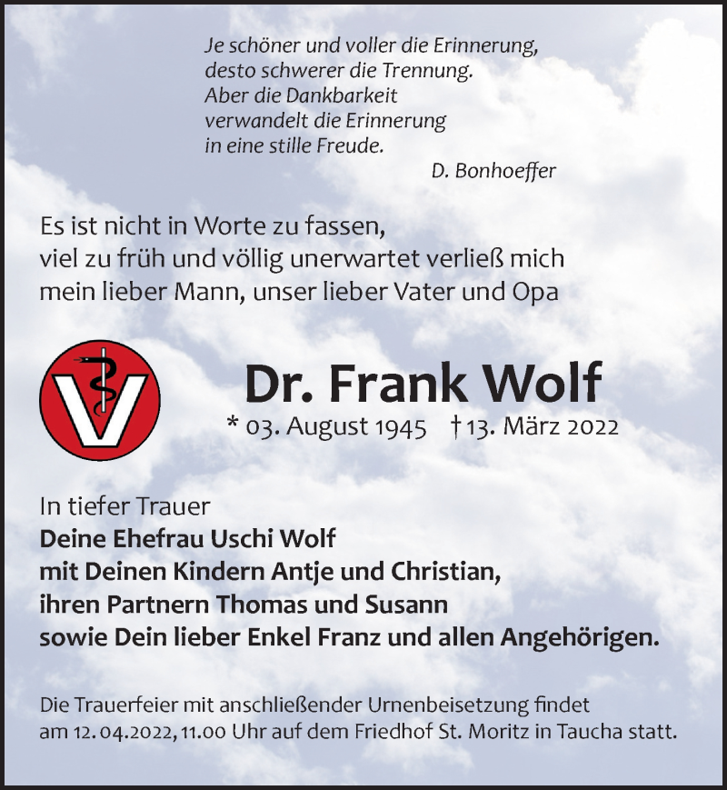 Hier finden Sie alle Traueranzeigen aus der Zeitung, die bisher für Frank Wolf erschienen sind. Weitere Traueranzeigen, die in der Zeitung erscheinen, werden hier ebenfalls aufgelistet