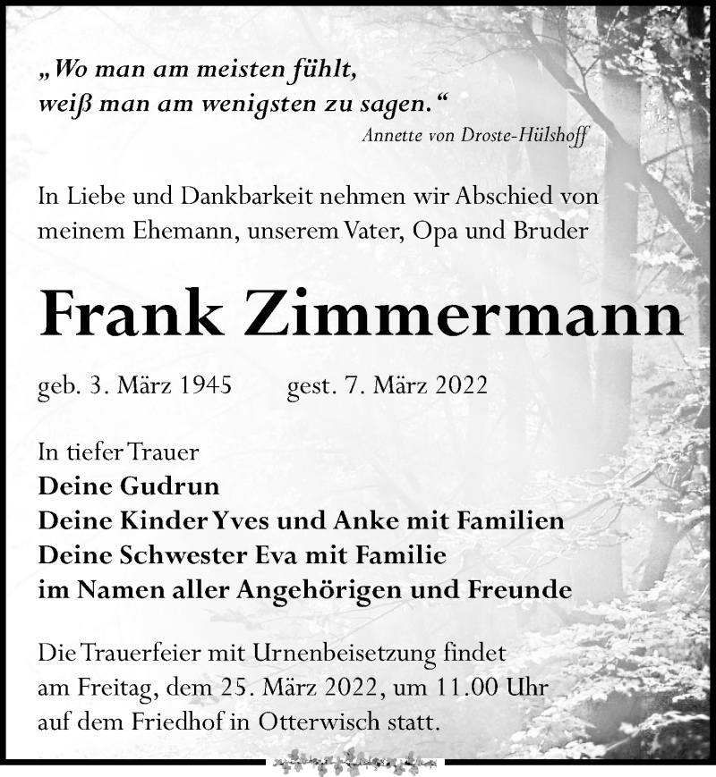 Hier finden Sie alle Traueranzeigen aus der Zeitung, die bisher für Frank Zimmermann erschienen sind. Weitere Traueranzeigen, die in der Zeitung erscheinen, werden hier ebenfalls aufgelistet