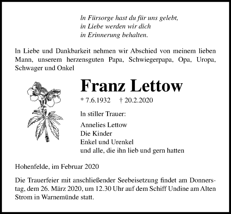 Hier finden Sie alle Traueranzeigen aus der Zeitung, die bisher für Franz Lettow erschienen sind. Weitere Traueranzeigen, die in der Zeitung erscheinen, werden hier ebenfalls aufgelistet