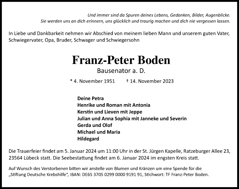Hier finden Sie alle Traueranzeigen aus der Zeitung, die bisher für Franz-Peter Boden erschienen sind. Weitere Traueranzeigen, die in der Zeitung erscheinen, werden hier ebenfalls aufgelistet