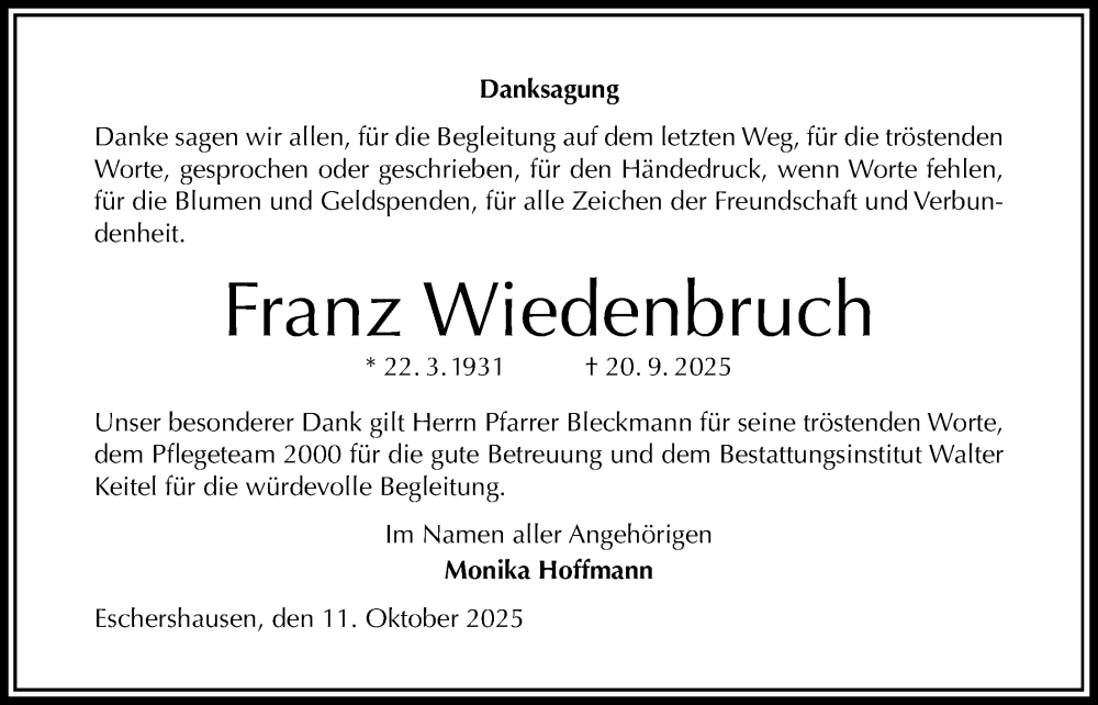 Hier finden Sie alle Traueranzeigen aus der Zeitung, die bisher für Franz Wiedenbruch erschienen sind. Weitere Traueranzeigen, die in der Zeitung erscheinen, werden hier ebenfalls aufgelistet