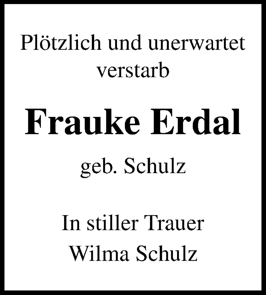 Hier finden Sie alle Traueranzeigen aus der Zeitung, die bisher für Frauke Erdal erschienen sind. Weitere Traueranzeigen, die in der Zeitung erscheinen, werden hier ebenfalls aufgelistet
