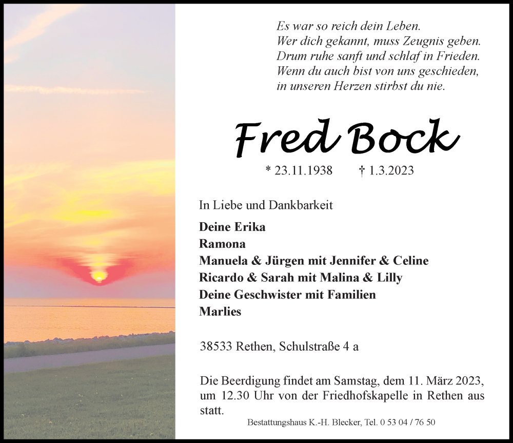 Hier finden Sie alle Traueranzeigen aus der Zeitung, die bisher für Fred Bock erschienen sind. Weitere Traueranzeigen, die in der Zeitung erscheinen, werden hier ebenfalls aufgelistet
