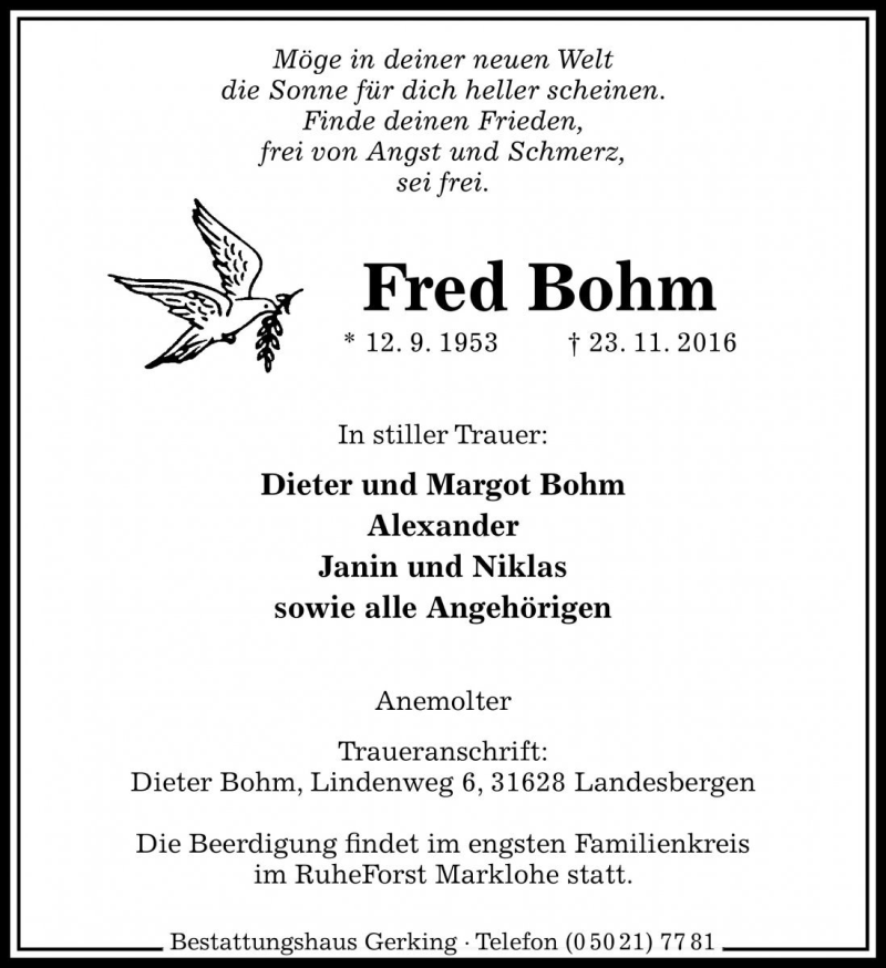 Hier finden Sie alle Traueranzeigen aus der Zeitung, die bisher für Fred Bohm erschienen sind. Weitere Traueranzeigen, die in der Zeitung erscheinen, werden hier ebenfalls aufgelistet