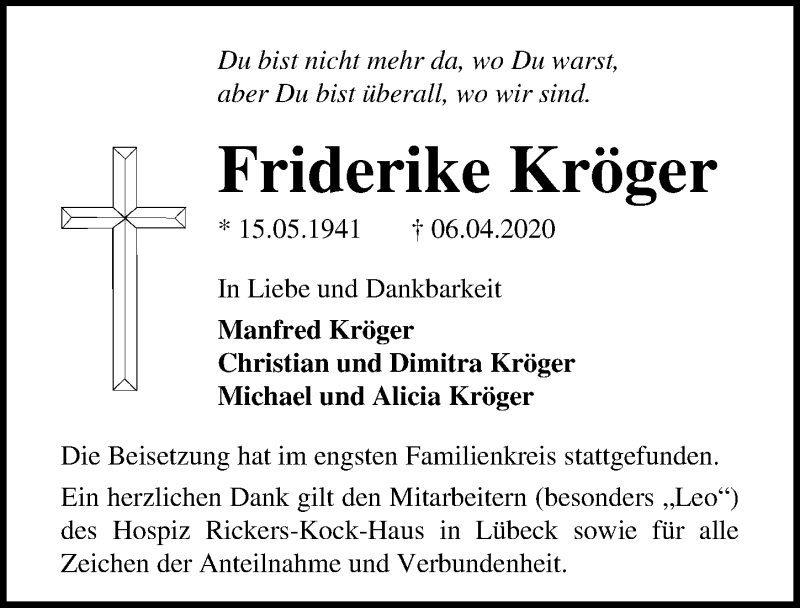 Hier finden Sie alle Traueranzeigen aus der Zeitung, die bisher für Friderike Kröger erschienen sind. Weitere Traueranzeigen, die in der Zeitung erscheinen, werden hier ebenfalls aufgelistet