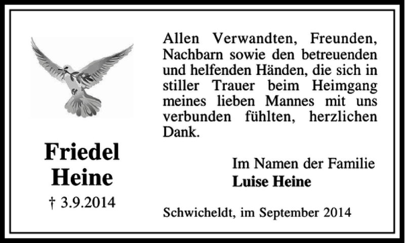Hier finden Sie alle Traueranzeigen aus der Zeitung, die bisher für Friedel Heine erschienen sind. Weitere Traueranzeigen, die in der Zeitung erscheinen, werden hier ebenfalls aufgelistet