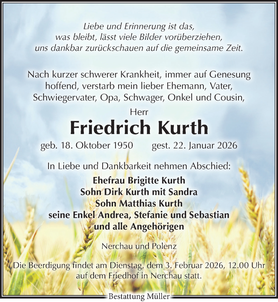 Hier finden Sie alle Traueranzeigen aus der Zeitung, die bisher für Friedrich Kurth erschienen sind. Weitere Traueranzeigen, die in der Zeitung erscheinen, werden hier ebenfalls aufgelistet