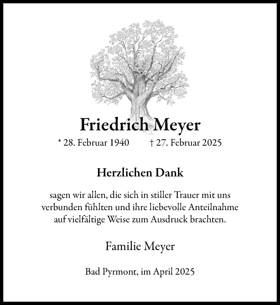 Hier finden Sie alle Traueranzeigen aus der Zeitung, die bisher für Friedrich Meyer erschienen sind. Weitere Traueranzeigen, die in der Zeitung erscheinen, werden hier ebenfalls aufgelistet