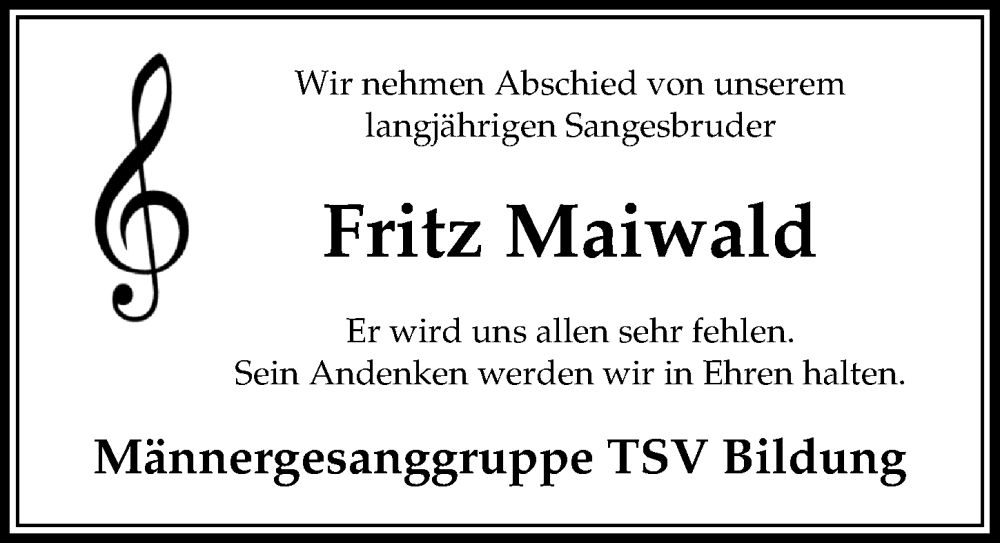Hier finden Sie alle Traueranzeigen aus der Zeitung, die bisher für Fritz Maiwald erschienen sind. Weitere Traueranzeigen, die in der Zeitung erscheinen, werden hier ebenfalls aufgelistet