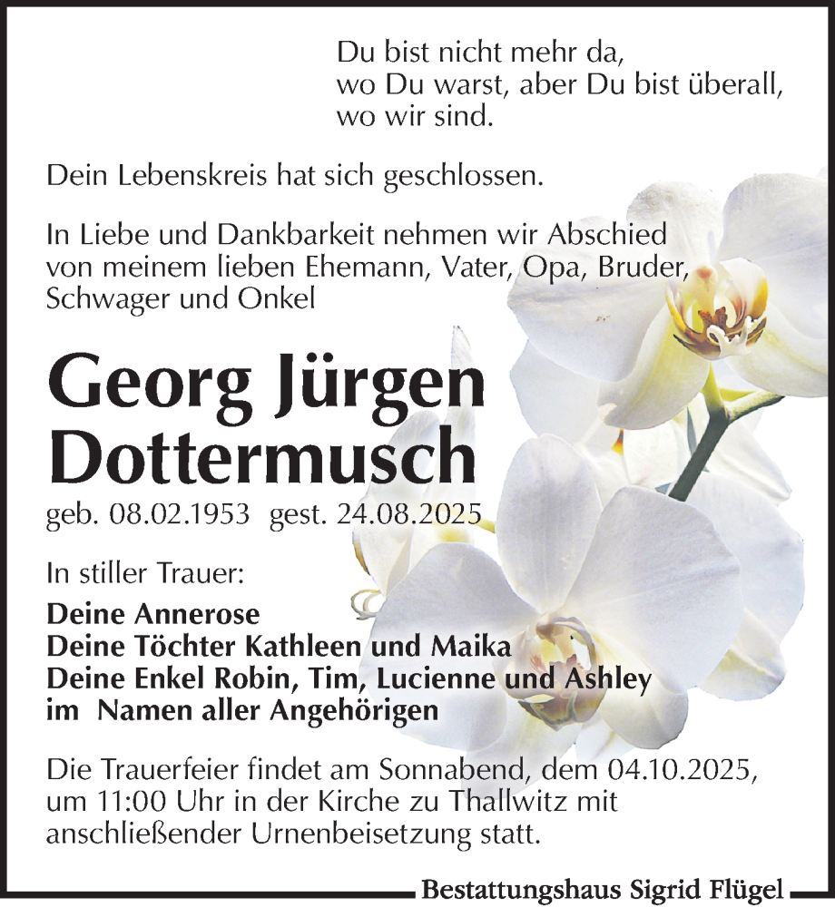 Hier finden Sie alle Traueranzeigen aus der Zeitung, die bisher für Georg Jürgen Dottermusch erschienen sind. Weitere Traueranzeigen, die in der Zeitung erscheinen, werden hier ebenfalls aufgelistet
