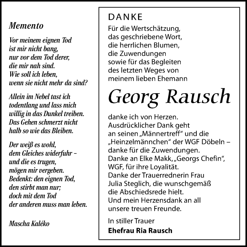 Hier finden Sie alle Traueranzeigen aus der Zeitung, die bisher für Georg Rausch erschienen sind. Weitere Traueranzeigen, die in der Zeitung erscheinen, werden hier ebenfalls aufgelistet